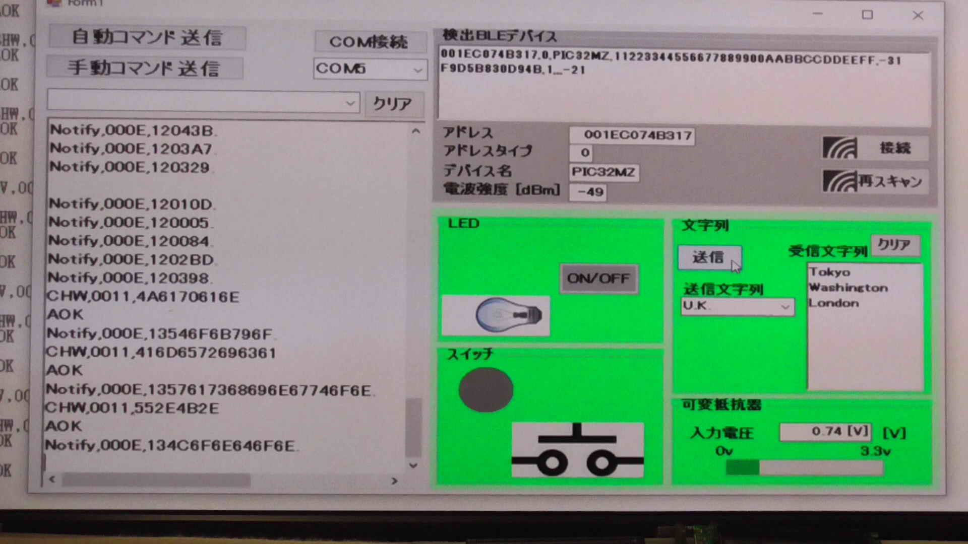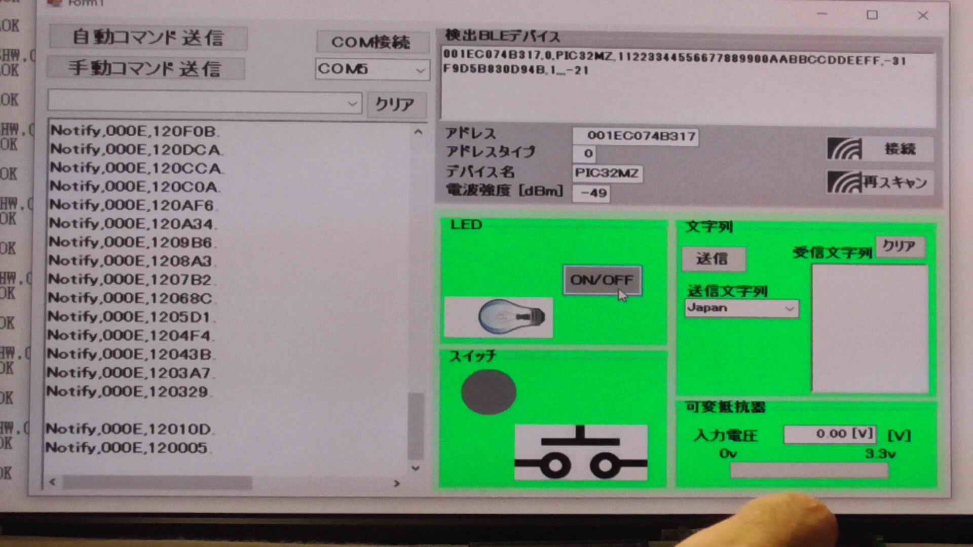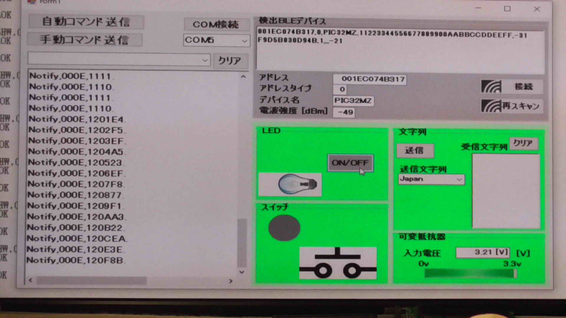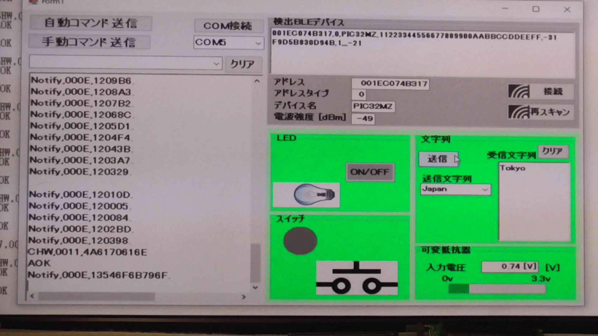 SendData("F//Start Scan"); //スキャン開始 375 ms for scan interval, 250 ms for scan window