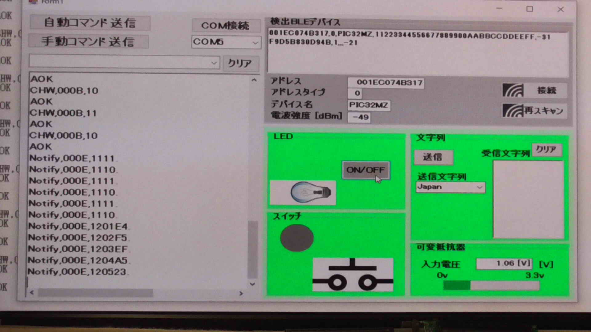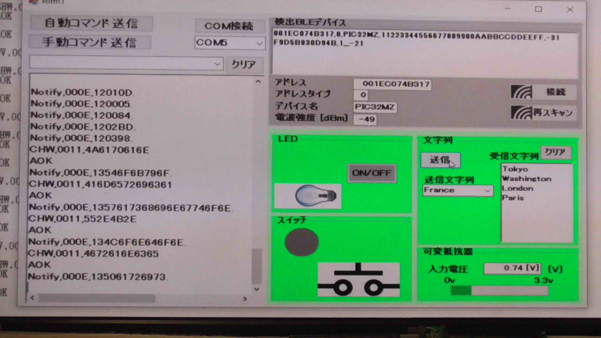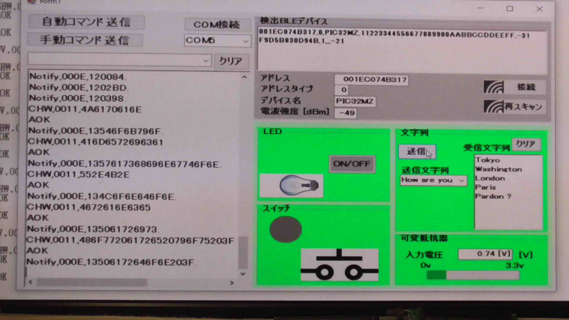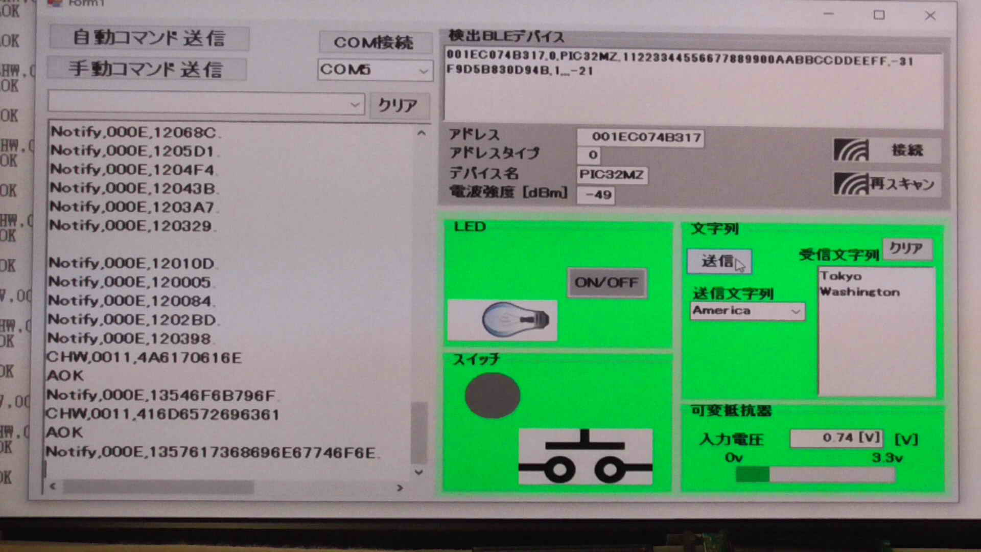 SendData("F//Start Scan"); //スキャン開始 375 ms for scan interval, 250 ms for scan window