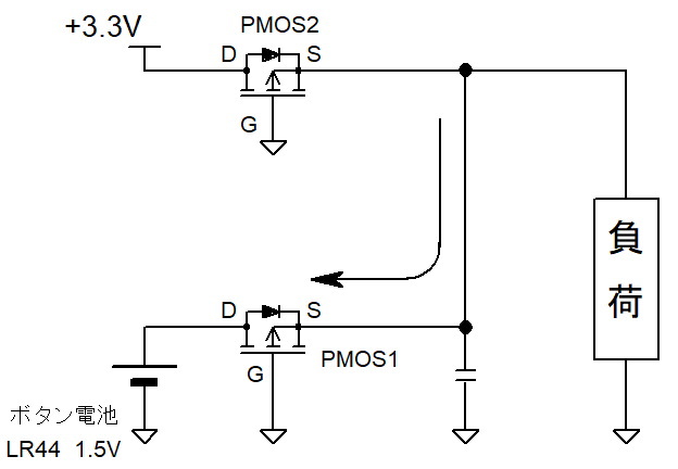 下図のような PMOSを2個使った高電圧優先回路はなりたたない。 なぜなら高電圧側のPMOS2から 低電圧側のPMOS1経由で電源(電池)へ