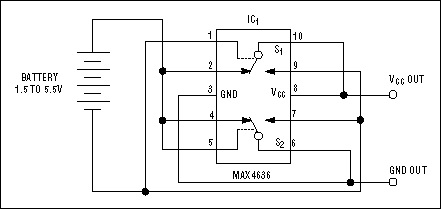 | バッテリ逆接続保護を提供する回路 バッテリ駆動機器に共通する問題は、エンドユーザがバッテリを逆に挿入した時の損傷の危険性です(エンジニアは、もちろんこんなことはしません)。ダイオード1個を挿入するかダイオードブリッジ構成を使えば損傷を避けることができますが、この解決法ではバッテリと電源レイル間に(1個または2個分の)ダイオード電圧降下が加わることにより、電力を浪費させ電源電圧を減らします。もう一つのソリューションは、バッテリ逆接続の損傷に対して保護を提供するだけではなく、自動的に逆接続を補正します(下図を参照)。ディスクリートダイオードによる電圧降下をなくすために、低オン抵抗DPDT (双極/双投)スイッチが全波整流器となります。図に示すように、バッテリが正しい極性で挿入されると、上側のスイッチS1は制御ピンがロー状態であるためノーマリクローズ状態になります。その結果生じるピン2からピン10への接続は、バッテリからVCC端子への低インピーダンス経路を提供します。逆に、下側のスイッチS2は、制御ピンがハイ状態であるためにノーマリオープン端子(図示せず)をクローズします。その結果生じるピン7からピン6への経路はバッテリの負端子をグランドに接続します。 IC1のESD保護ダイオードはスタートアップを保証し全波整流器として動作します。バッテリ電圧が1Vを超えると、アナログスイッチ内のMOSFETがオンになります。この20ns以下のターンオン時間により回路は逆極性バッテリ接続のリードを迅速に交換することで通常動作を維持することができます。回路抵抗はバッテリ電圧に依存します。回路が4つのNiCd、NiMH、またはアルカリ電池で動作する場合、整流器の各側の抵抗は2.5Ω (合計5Ω)です。2セル電池(2.4V~3V)で動作している場合は全抵抗が10Ωとなります。IC1の動作定格は最大5.5Vで連続電流が30mAであるため、この回路はコードレス電話、ポータブルオーディオ機器、ハンドヘルド電子機器、その他の小~中電流アプリケーションに適しています。IC1の超小型10ピンµMAXパッケージは4つのスルーホール信号ダイオードよりも小さな面積に収まり、2つのSOT-23デュアル信号ダイオードと殆ど同じくらい小型です。 |