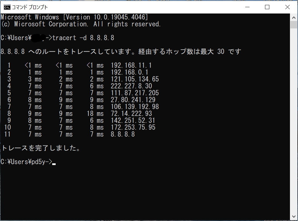 コマンドプロンプトから "tracert -d 8.8.8.8"を入力する。 結果に ローカルIPアドレスが2行表示されていらた2重状態である。