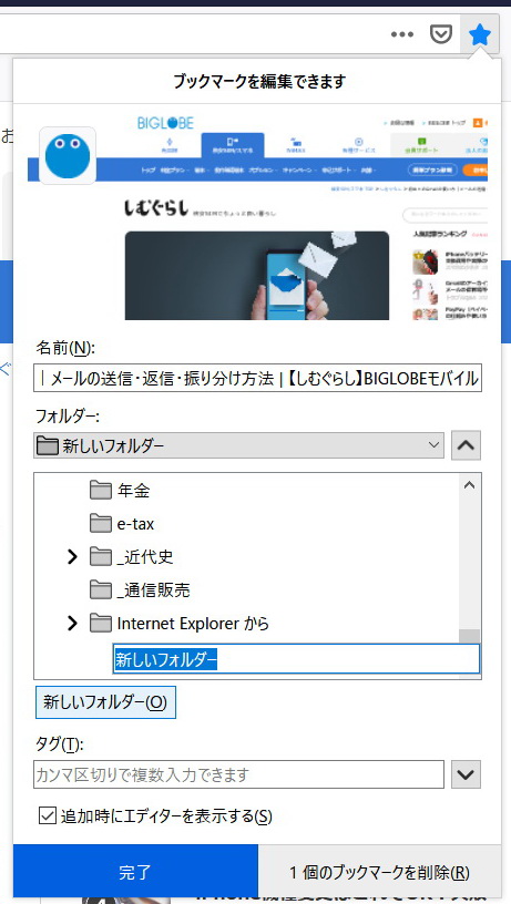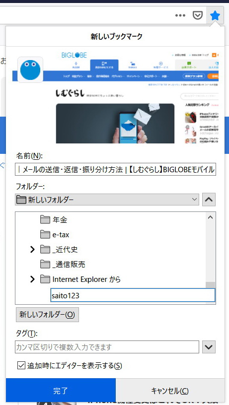 | 4. フォルダができる | 5. フォルダ名を命名 | 6. 命名フォルダの中に ブックマークしたURLが作成される。 | |