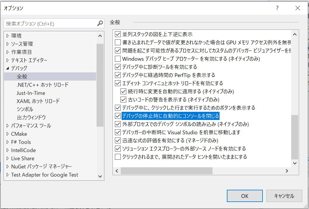 → "デバック停止時に自動的にコンソールを閉じる" のチェックボックスにチェックを追加する