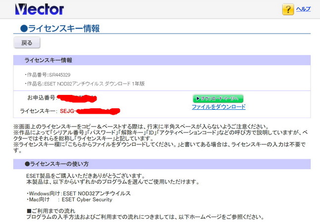 NOD32を ダウンロード販売から 仲買業者(Vectorなど)から購入するとライセンスキーが送られてくる。このライセンスキーをもとに