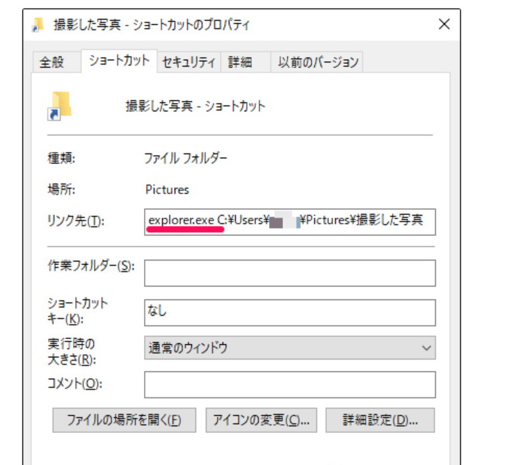 2. ショートカットのプロパティの保存先の先頭にexplorer.exe を打鍵する
