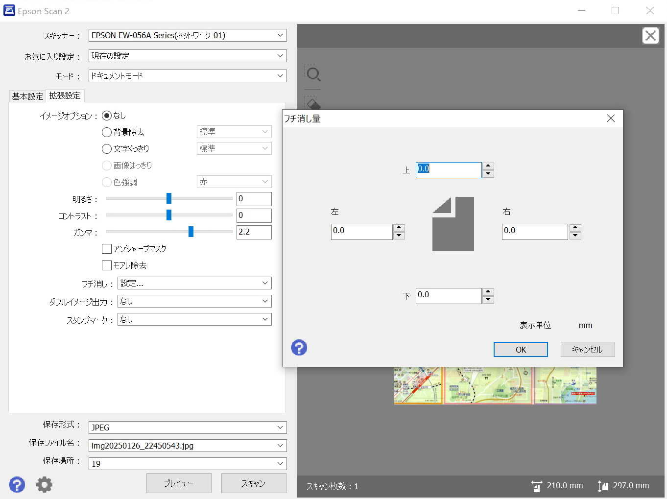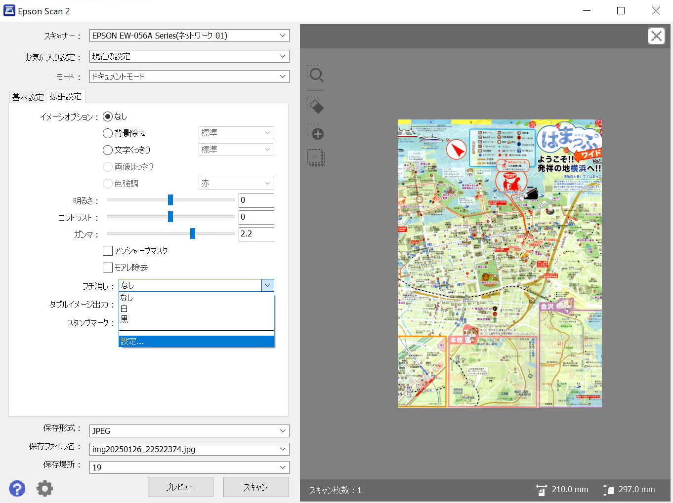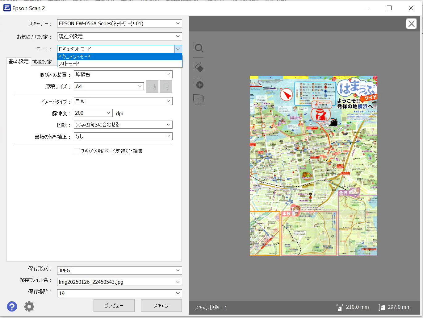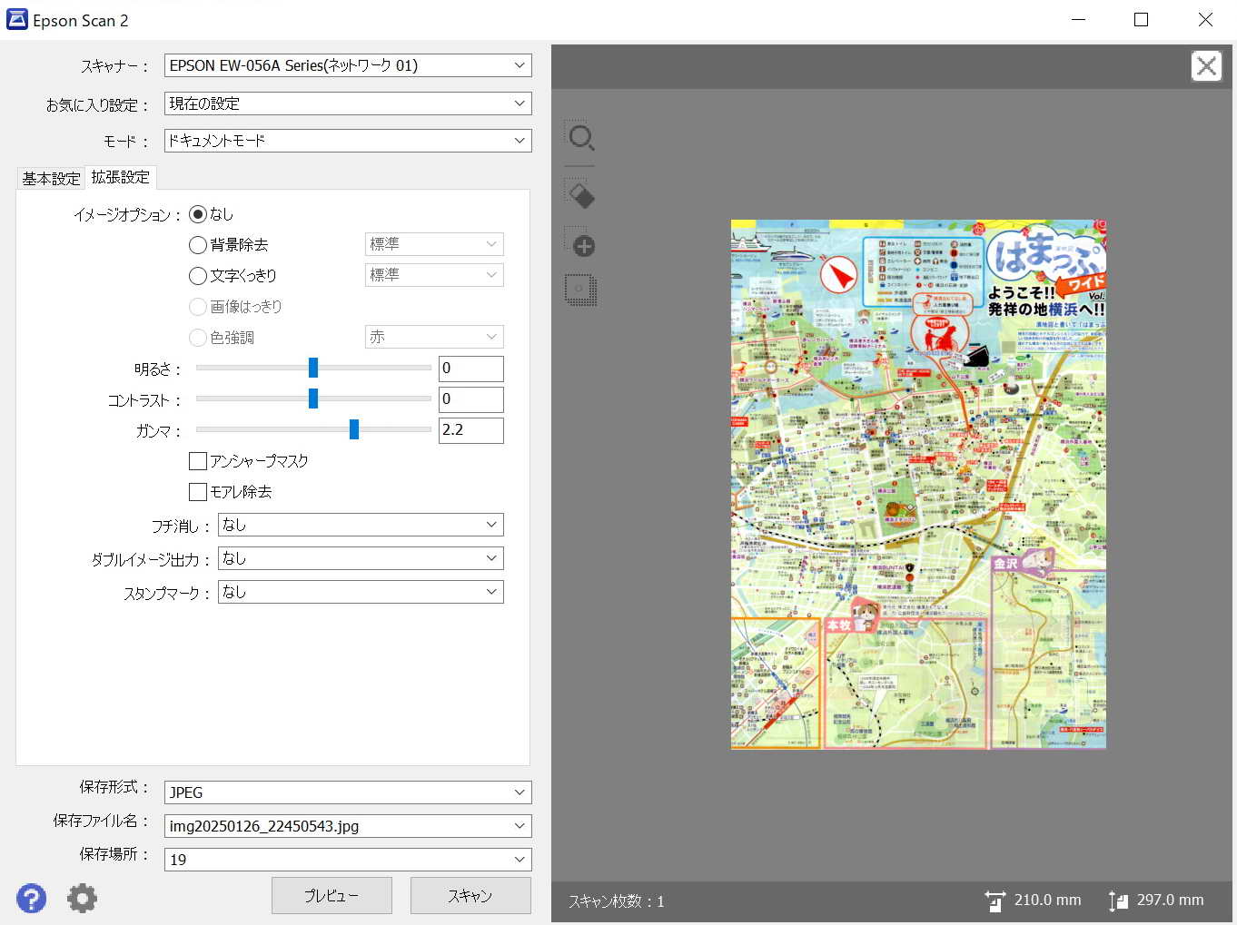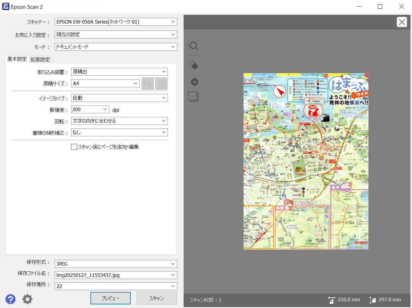 以上の設定により 基本設定タブの画面にもどり、ファイルの画像保存形式(jpg、pdfなど)選択、保存場所を選択、プレビュー、スキャンを実行する。