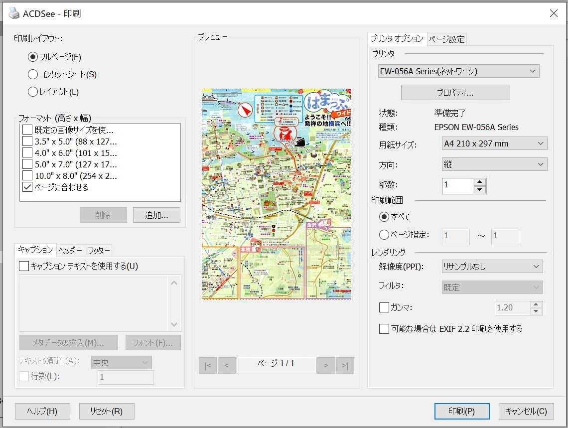 | 1.Epson scan2により、フチ消し量0.0 フチなしでプレビュー、スキャンを行いjpgの画像ファイルを作成 | 2.エプソンEW-056Aのプリンタドライバーをインストール後、acdSeeの印刷を行う | 3.印刷際しては ページ設定タグの 余白の設定を0.0にしておくこと | 4.以上のような設定で画像ファイル作成して印刷すると 1/1のコピーが作成できる |