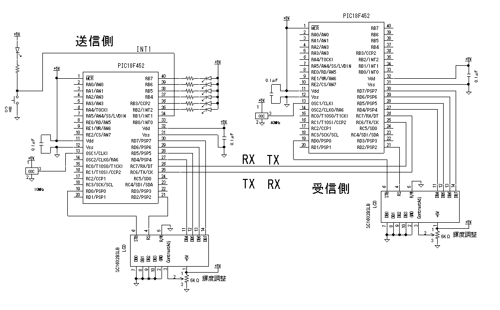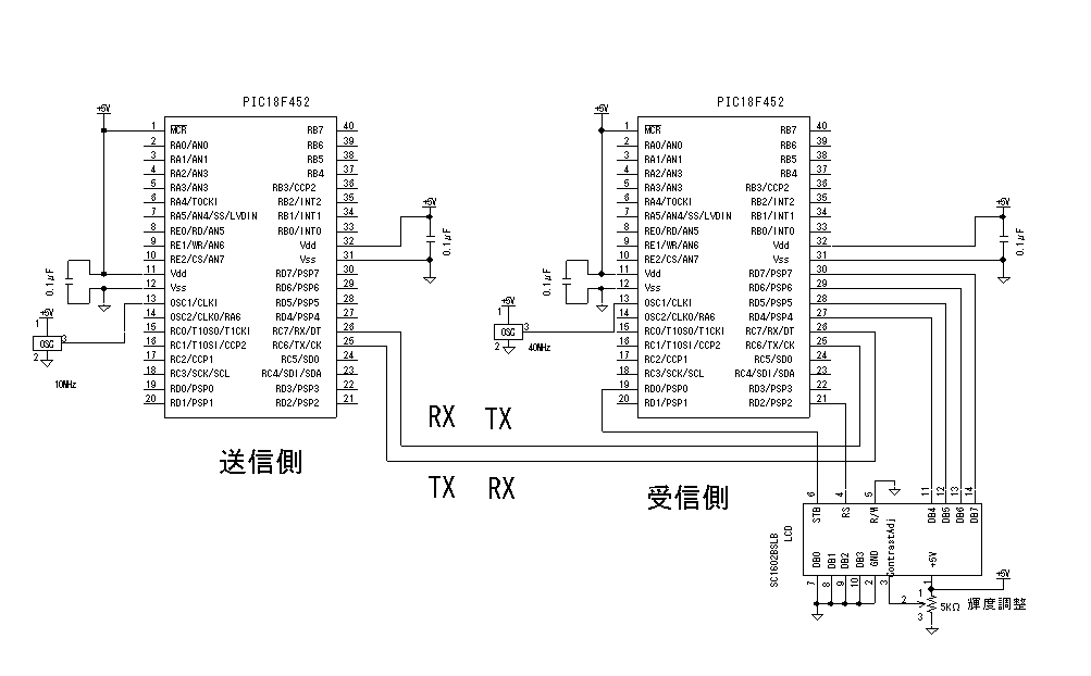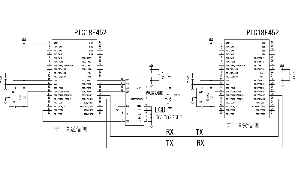 PIC18F452×2をつかった場合の回路図を以下に示します。