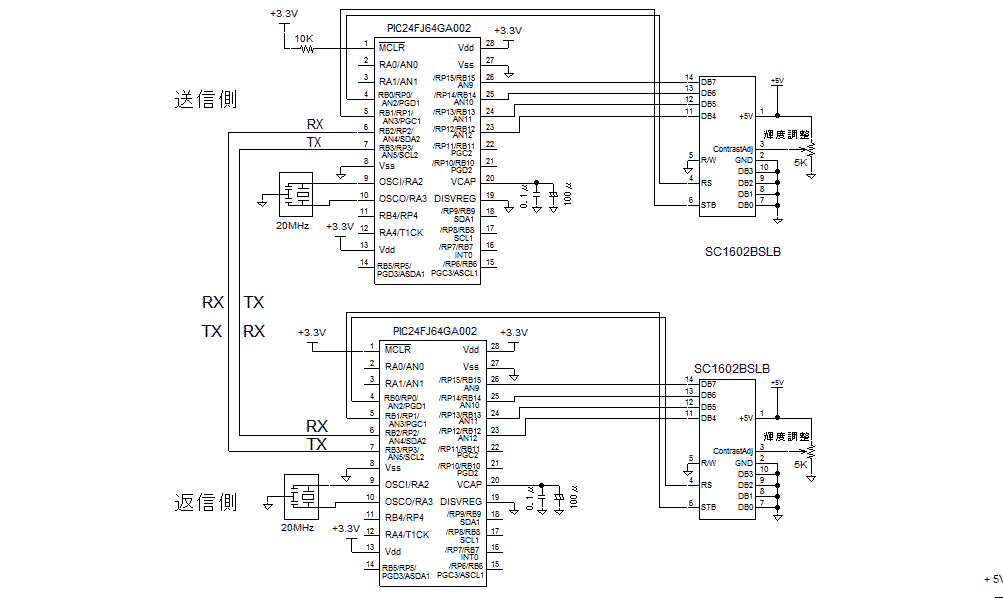 ・ 受信側PICでは受信文字列、返信文字列を液晶に表示する。