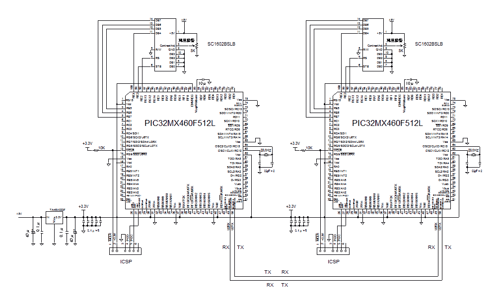 PIC同士それぞれのTX、RX端子をタスキがけに直接接続するだけでRS232C通信が可能です。以下に、RS232Cによる