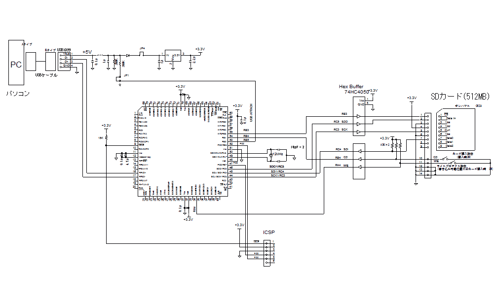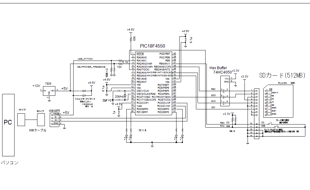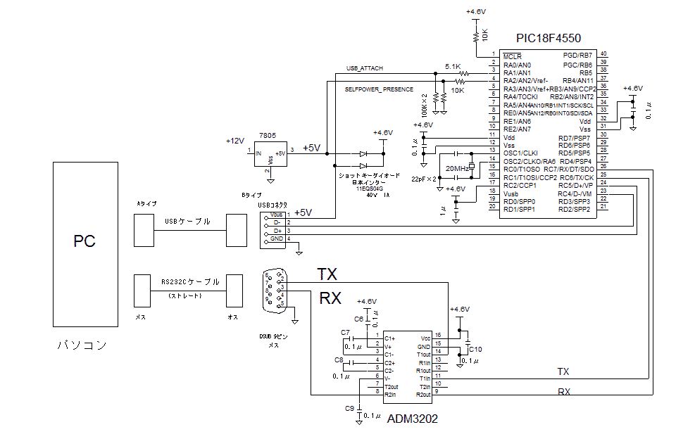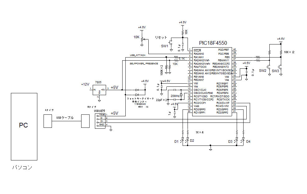 PIC18F4550をつかった場合の回路図を以下に示します。