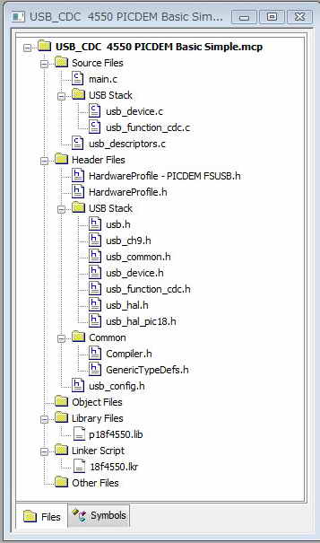 USB Device - CDC - Basic Demo - C18 - PICDEM FSUSB.mcpに含まれているファイルの抜粋です。プログラム生成に際し関係するファイルは