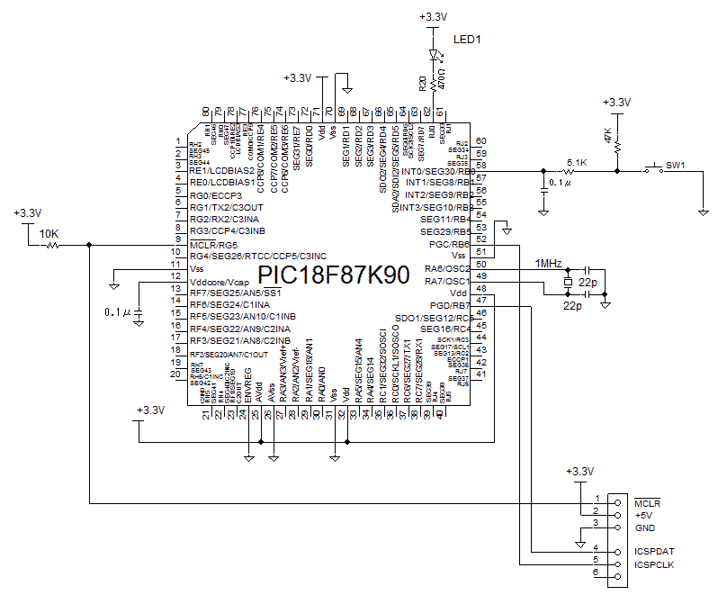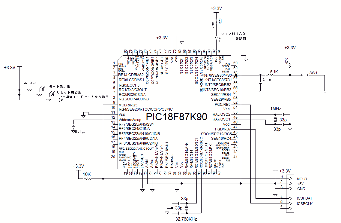 PIC18F87K90をつかった場合の回路図を以下に示します。
