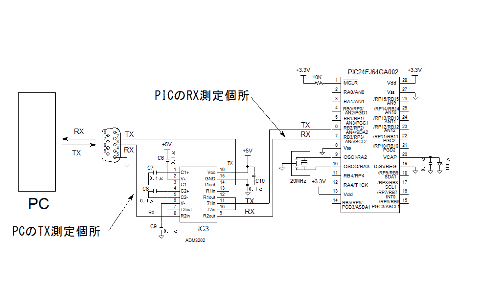 ・ PCからPICに文字データをおくり、PCのTX 及びPICのRXの波形を観測する