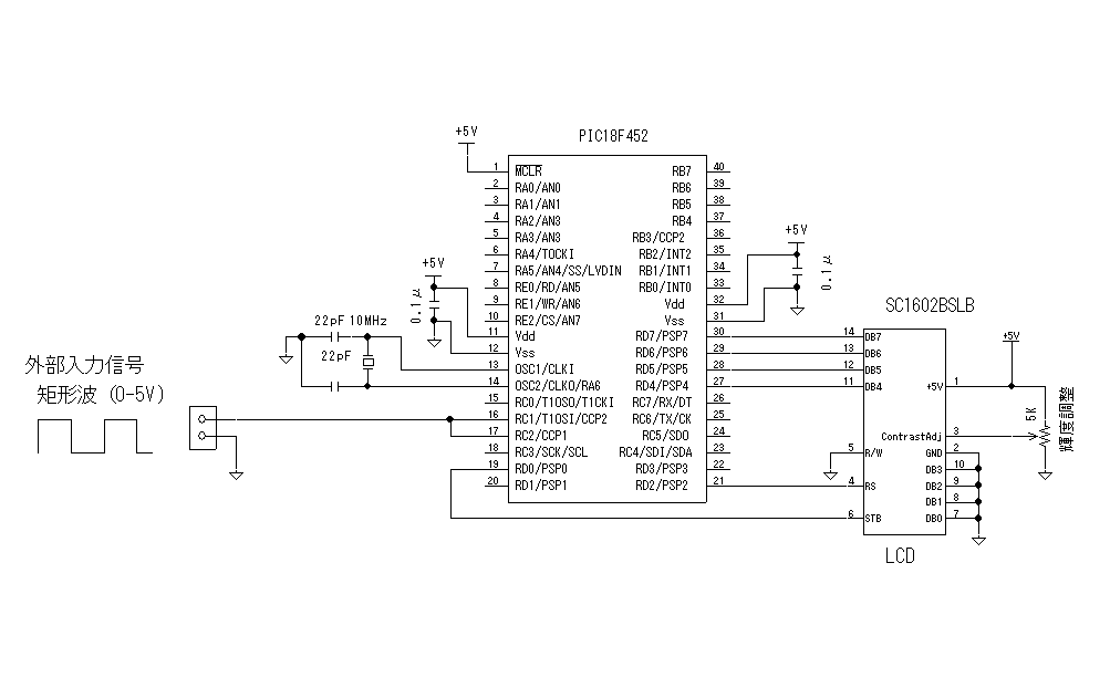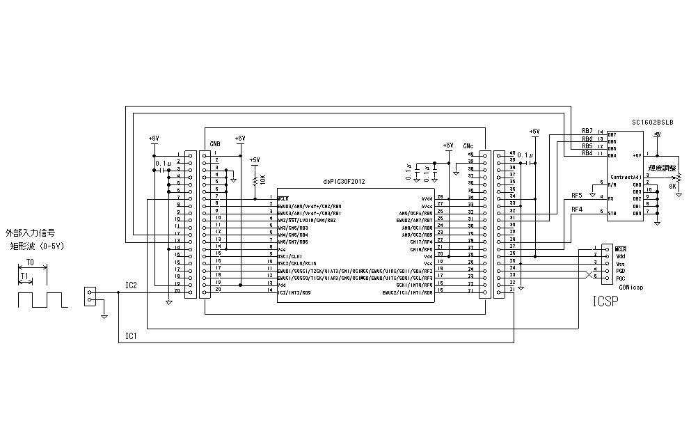 ・ CCP1、CCP2 キャプチャー入力端子に入力された矩形波のHighレベル時のパルス幅を測定し液晶の1行目に