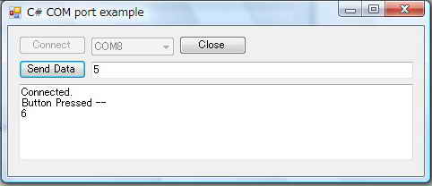 B PC側ダイアログウィンドウで通信するCOMポートをコンボボックスから選択する。