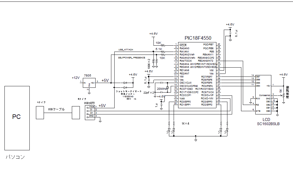 PIC18F4550をつかった場合の回路図を以下に示します。