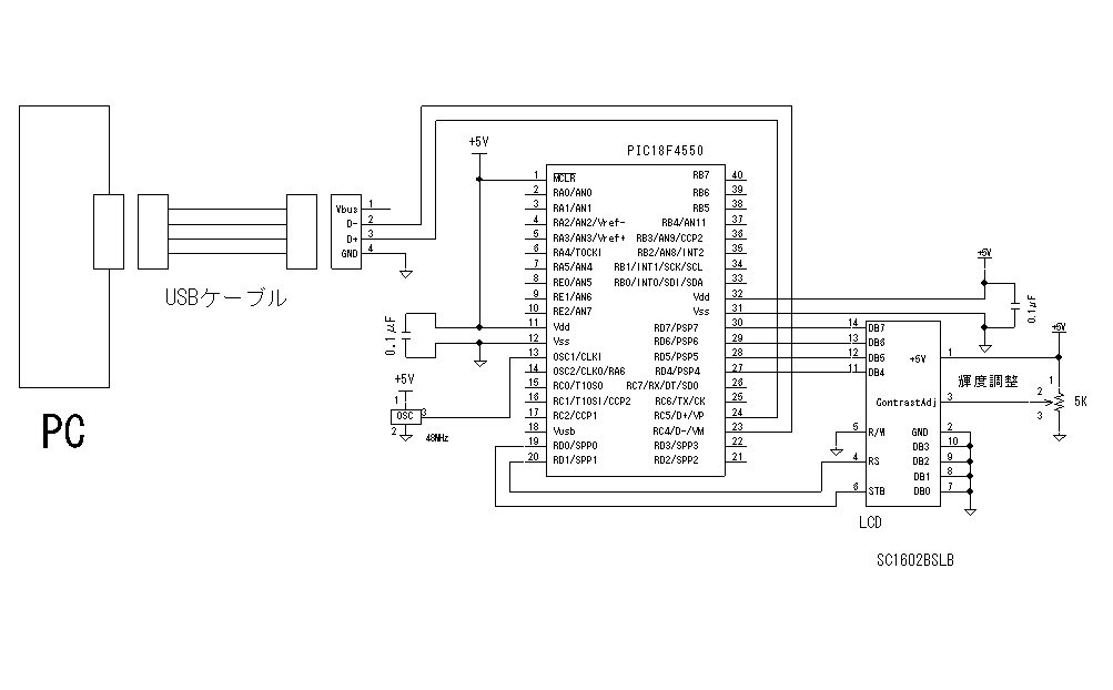 PIC18F4550をつかった場合の回路図を以下に示します。