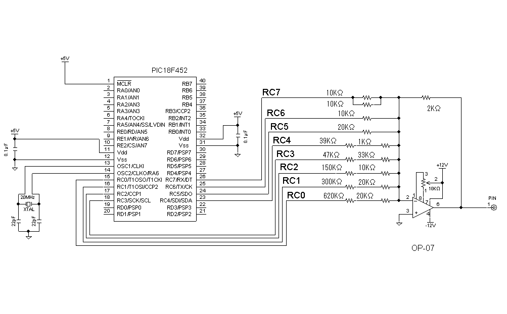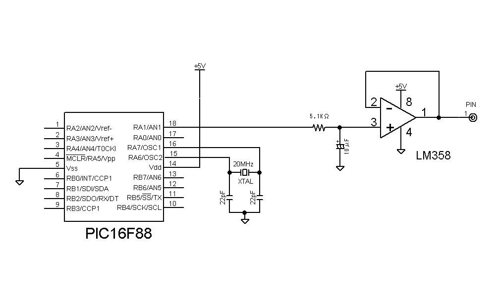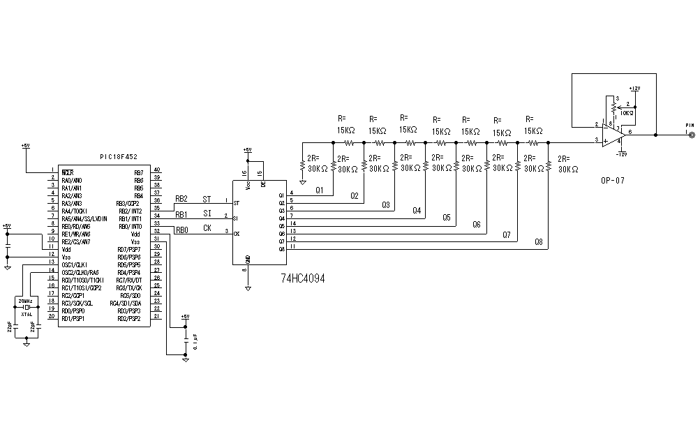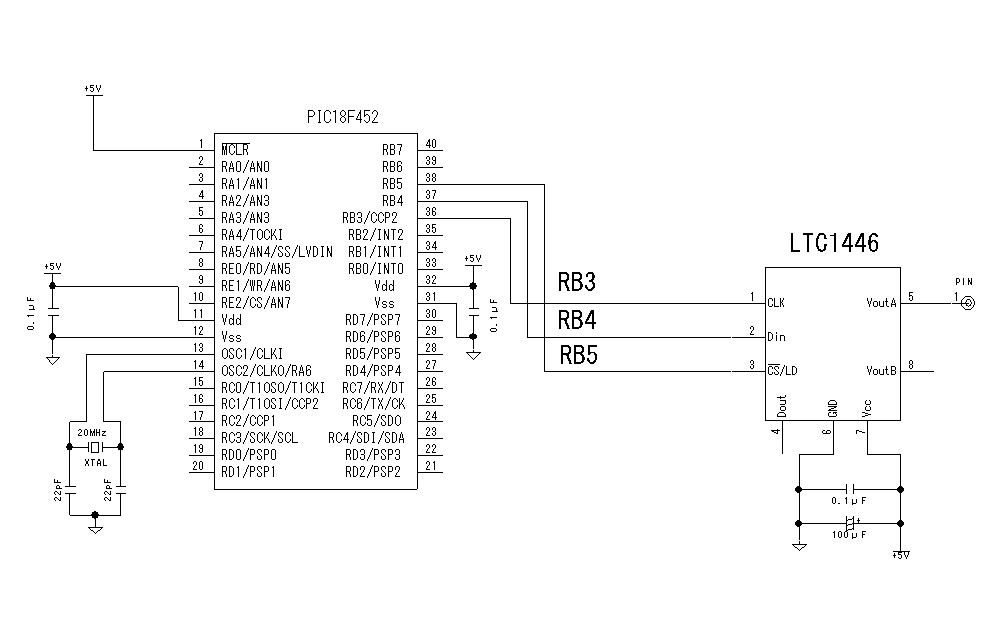 PICにはアナログ電圧を出力できるポートはありません。したがってデジタルポートに若干のハードを追加して