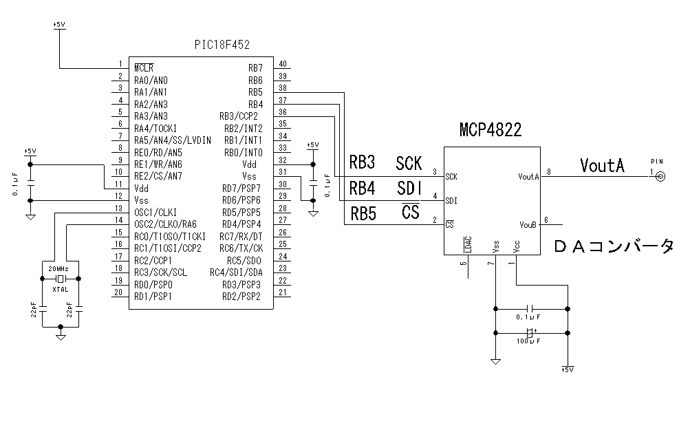 12ビットDAコンバータICとしてマイクロチップテクノロジーのMCP4822を使った場合の例を紹介します。MCP4822は