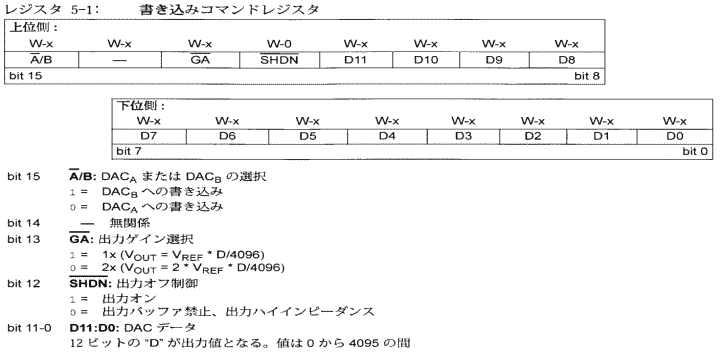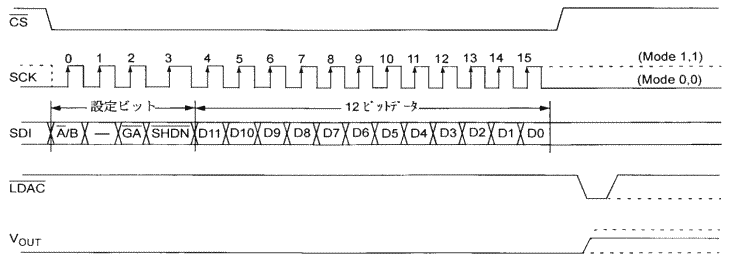 下記のタイミングチャート、書き込みコマンドレジスタへの書き込み要領にしたがってパルスを送ります。MCP 4822