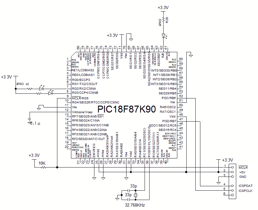 PIC18F452をつかった場合の回路図を以下に示します。外付けの水晶発振子の周波数は10MHzですがPIC内部の