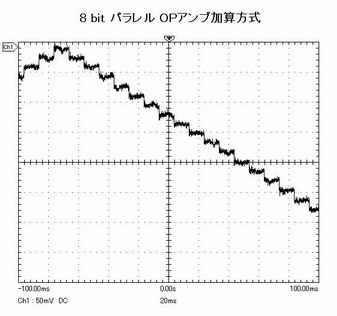 デジタル出力ポートに重みを付けオペアンプで加算する8ビットのDAコンバータの例を紹介します。この方式のDA