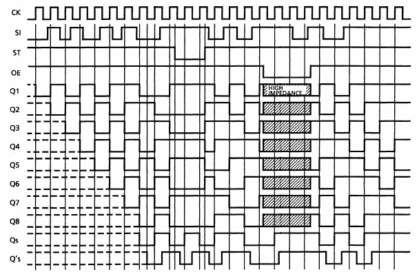 I LSBを出力後、CKをLowにしたらSTをHighにする。この時Q8〜Q1のレジスタの値が同時に出力される。