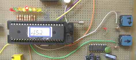 PIC18F452をつかった場合の回路図を以下に示します。外付けの水晶発振子の周波数は10MHzですがPIC内部の