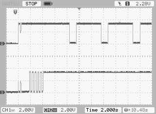 RG2ポートの波形です。 スリープから ウェイク直後リセットがかかり、プログラムが再起動していることが確認できます。