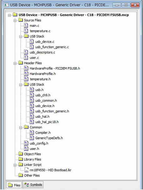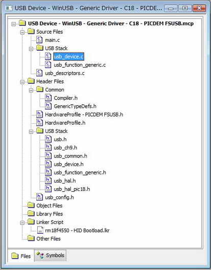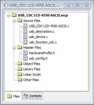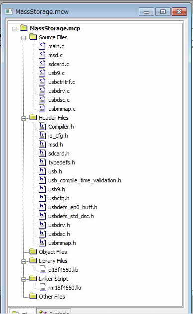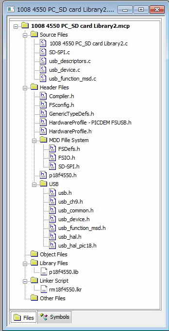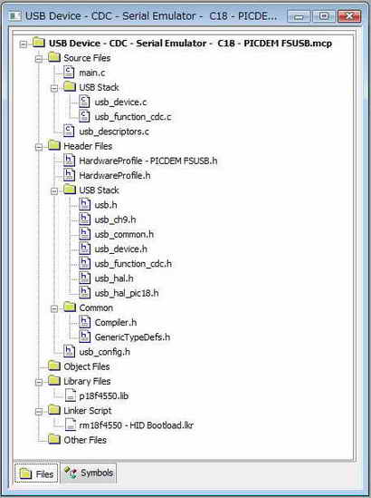 USB Device - CDC - Basic Demo - C18 - PICDEM FSUSB.mcpに含まれているファイルの抜粋です。プログラム生成に際し関係するファイルは