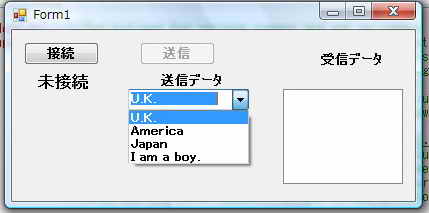 B PC側ダイアログウィンドウで通信するCOMポートをコンボボックスから選択する。