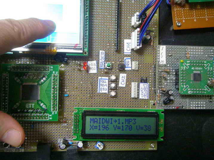 | 液晶にタッチしたところです。 ・キャラクタ液晶の下段に液晶画面の左上隅を 原点とするタッチ位置の座標系( X = 0〜320、Y = 0〜240)の タッチ位置 (196,170) が 表示されています。 |