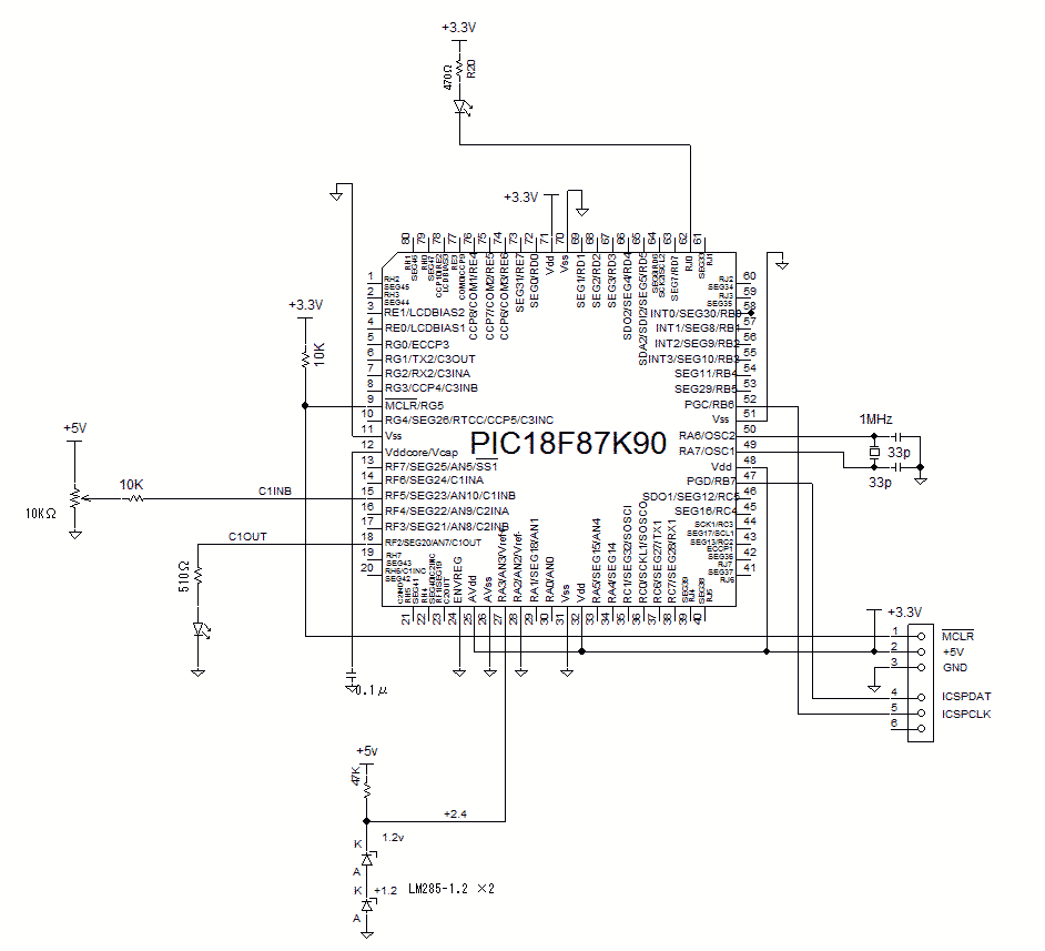 PIC18F87K90をつかった場合の回路図を以下に示します。