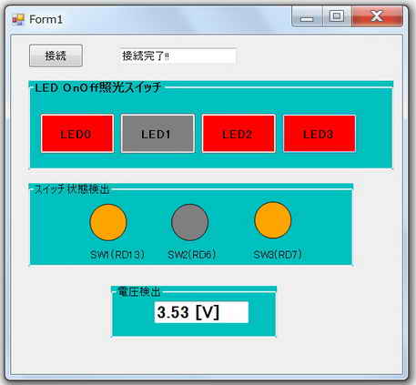 ・USB通信ONのボタンボタンスイッチをフォーム上にもうけること。 またUSB通信が確立したら”接続完了!”の文字をテキストボックスに表示のこと